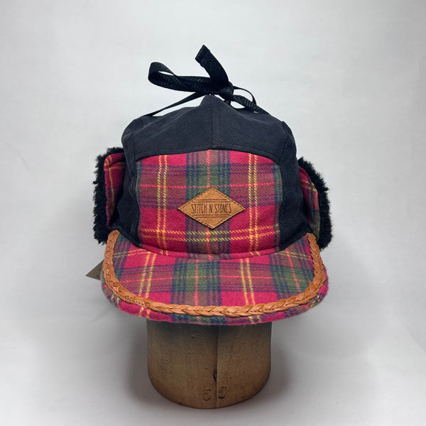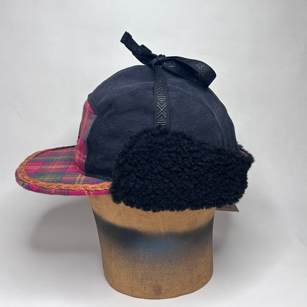 Unik Vinterkeps sydd av överblivna material. För den här kepsen har vi använt ett par utslitna svartgråa canvasbyxor, ett rutigt flanneltyg tyg från secondhand och ett svart teddytyg från outdoormärket Klättermusen i Åre. Innerfodret är restmaterial från Woolpower, ullfrotté som värmer gott. Läderetiketten är skuren och bränd med laser i Undersåker och allmogebandet är vävt i Sverige. Kepsen är klippt och sydd av Anna och Emma i Åre.