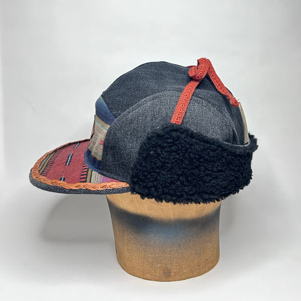 Unik Vinterkeps sydd av överblivna material. För den här kepsen har vi använt ett par utslitna svartgråa jeans, ett mönstrat tyg från en utsliten tröja och ett svart teddytyg från outdoormärket Klättermusen i Åre. Innerfodret är restmaterial från Woolpower, ullfrotté som värmer gott. Läderetiketten är skuren och bränd med laser i Undersåker och allmogebandet är från secondhand. Kepsen är klippt och sydd av Anna och Emma i Åre.